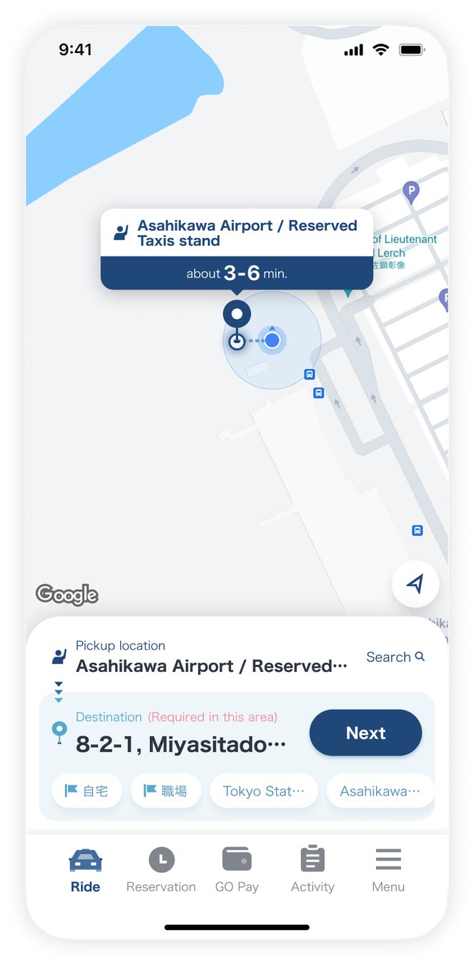 『GO』での注文時に旭川空港エリア内を選択すると、自動的に『GO』のりばである予約タクシー専用駐車場が乗車地に設定され、目的地を入力することで注文が可能となります。