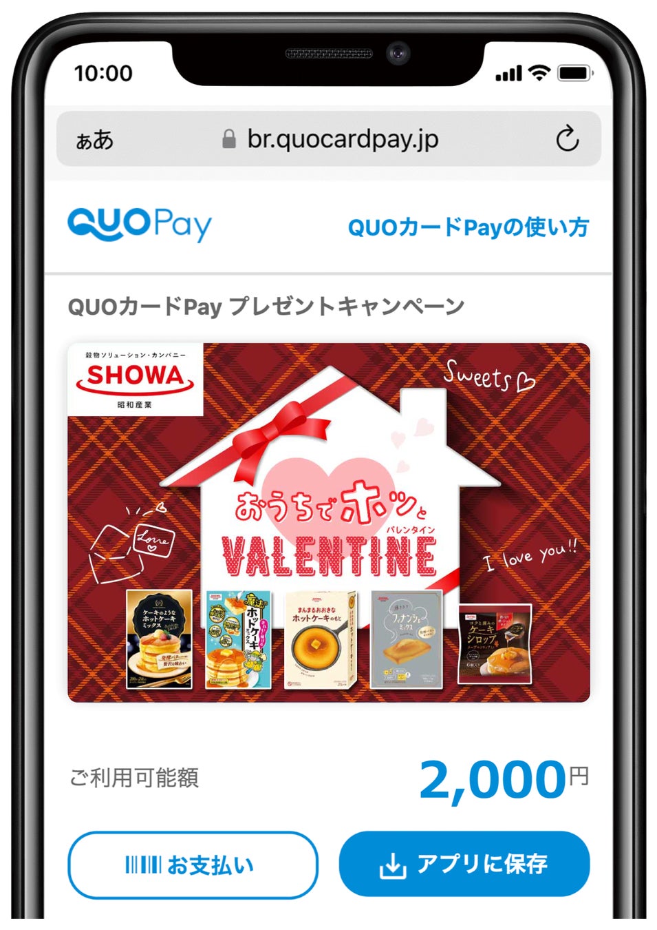 株式会社クオカード(以下当社、本社:東京都中央区、代表取締役社長:近田 剛)が展開するスマートフォンで使えるデジタルギフト「QUOカードPay(クオ・カード ペイ)」は、1月10日(金)より昭和産業株式会社が開催する『おうちでホッとバレンタインキャンペーン』で採用されました。