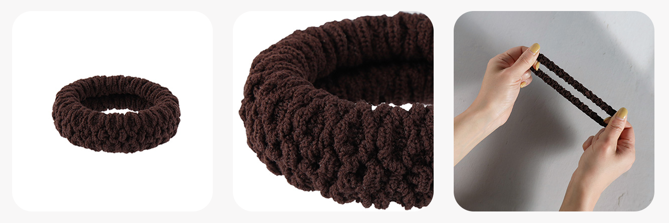 当製品は、ボリューミーな形状と、クシュっとした質感がおしゃれなヘアゴムです。一般的なシンプルな黒ヘアゴムとは異なるさりげないデザイン性が、高級ホテルにもマッチします。さらに、柔らかい素材で縛った跡がつきにくく、よく伸びるため使い勝手もよい点が魅力的。カラーもブラウンを採用しており、宿泊後に持ち帰り、普段使いしていただきやすいです。
