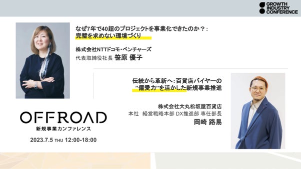 「OFFROAD」は、設立50周年を迎える累計上場社数1,000社以上を誇るジャフコグループ株式会社が、Co-nnect Inc.合同会社・WeWork Japan 合同会社と共催する、新規事業担当が困難を共有し、学ぶことをテーマとした新規事業カンファレンスです。「GRIC 2023」がオンライン開催するイベントプラットフォーム「EventHub」にて、2023年7月5日に開催される「OFFROAD」のライブセッションをお楽しみいただくことができるほか、新規事業担当者同士の交流が可能です。
