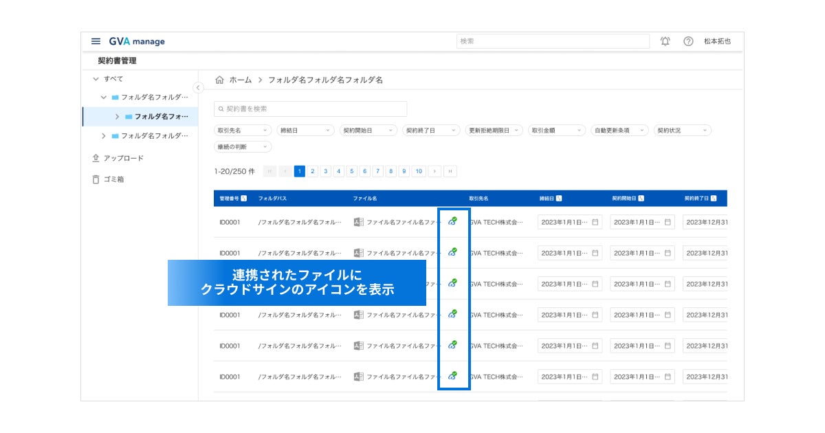 「クラウドサイン」と連携されたファイルにはアイコンが表示されるため、連携状況を一覧で確認できます。