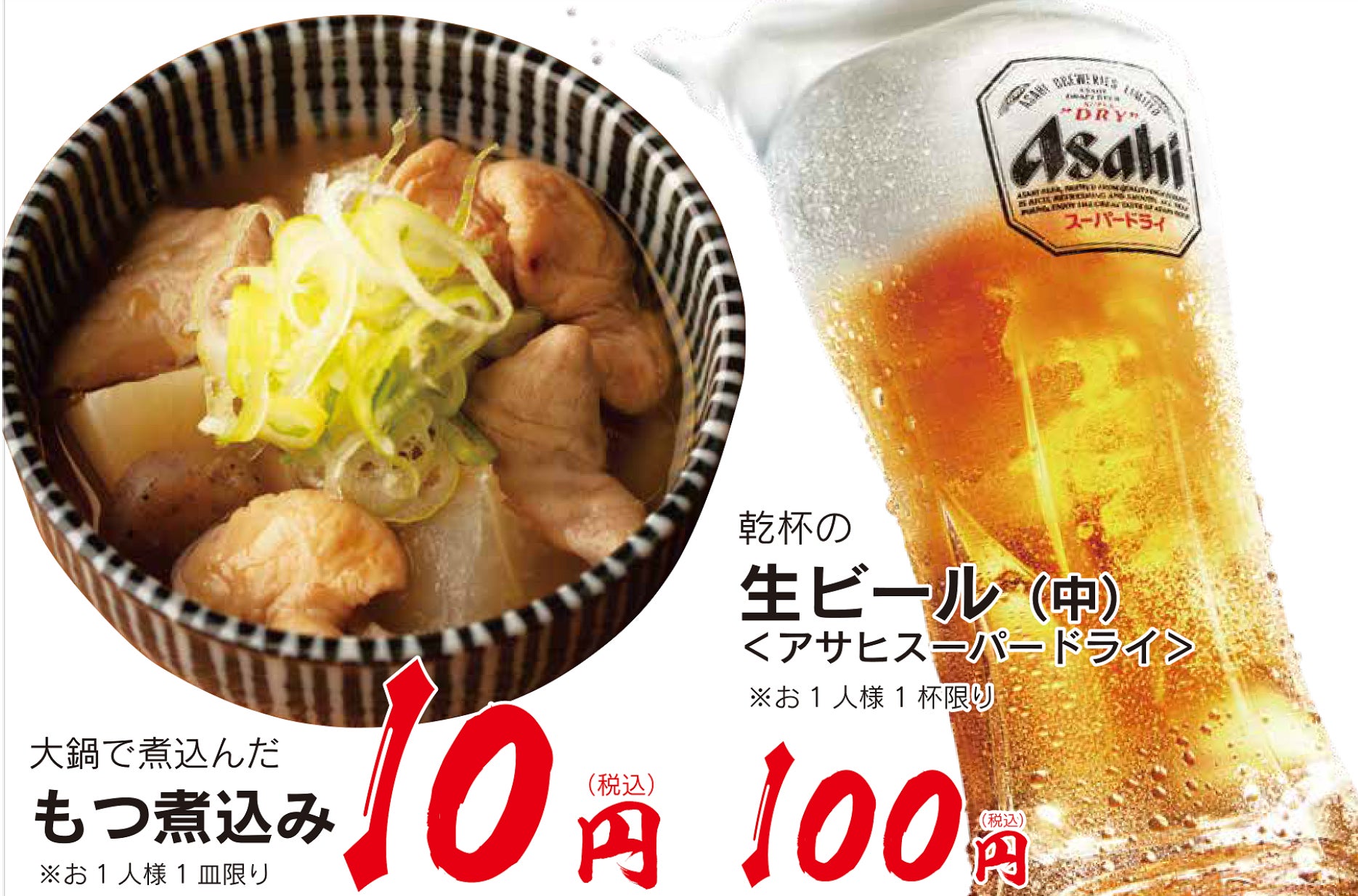 【内容】期間中もつ煮込み 1皿10円・生ビール(中)1杯100円にて提供