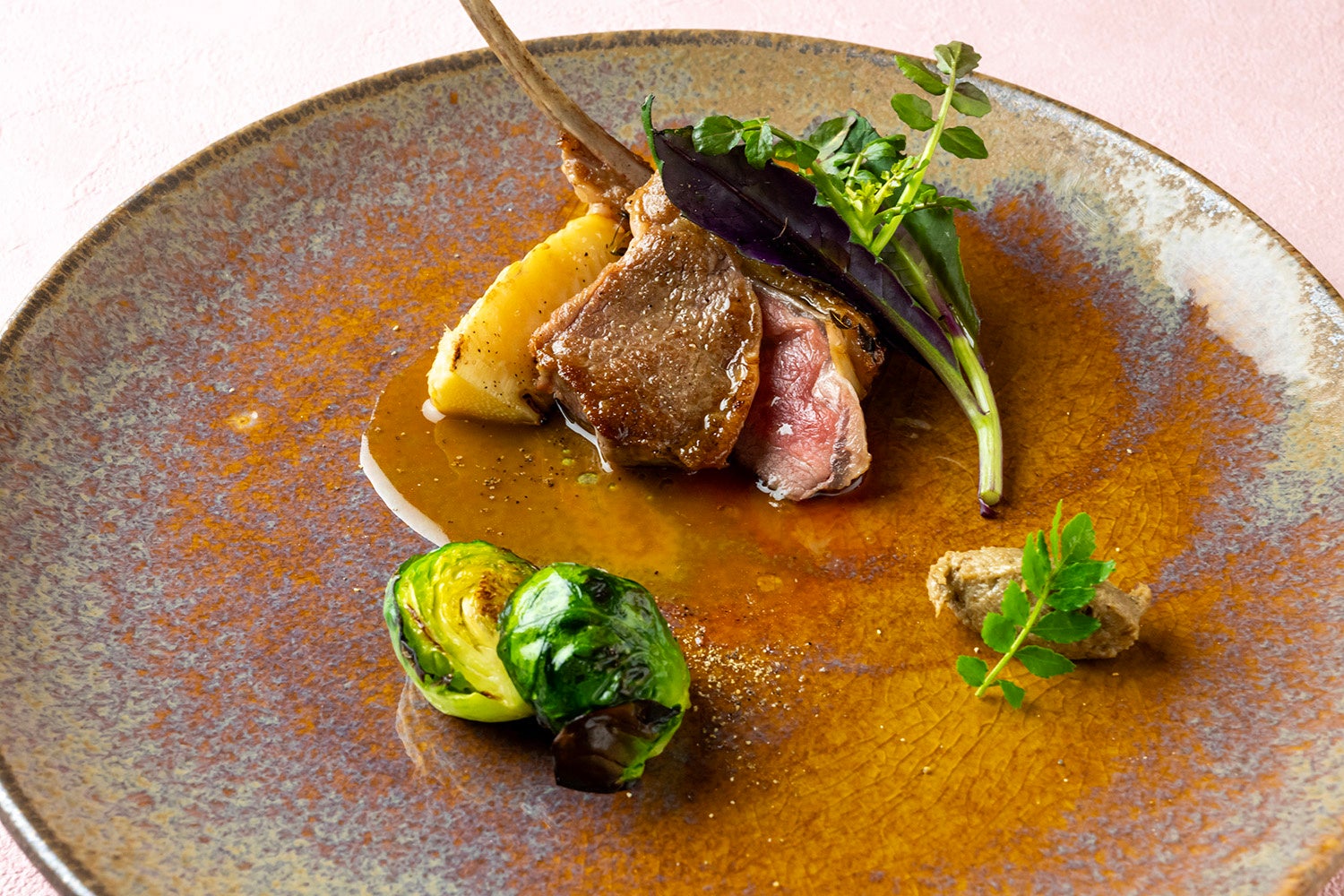 ロゼ色に焼き上げた仔羊肉に、春を感じる ばっけ味噌(ふきのとう味噌)とマスタードのソースを合わせて。
