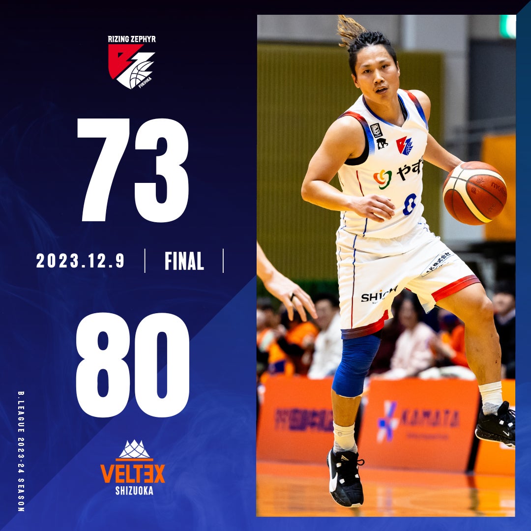 2023年12月9日(土)に開催されました【ベルテックス静岡vs.ライジングゼファーフクオカ】において“奈良80-73福岡”の結果となりましたことお知らせいたします。