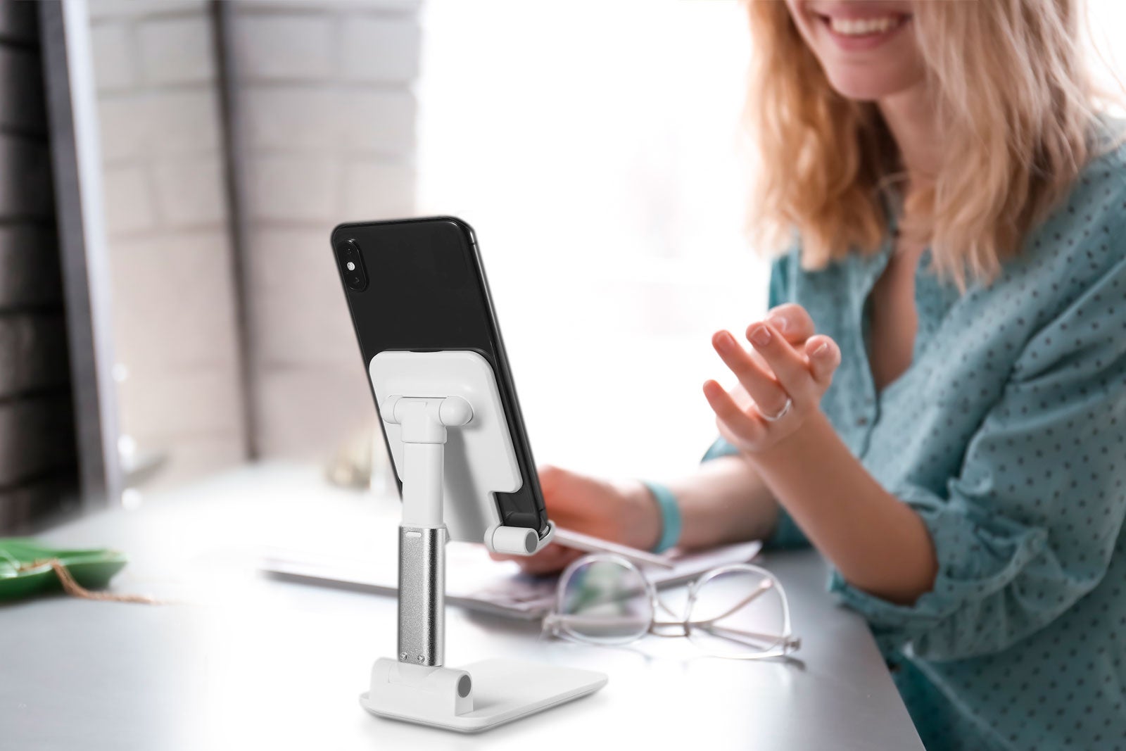 ポータブルサイズの折りたたみ式スマートフォン用デスクトップスタンド。角度、高さ調節可能。滑り止め機能付き。タブレット、Nintendo Switch対応。ホワイト、ブラックの選べる2色!