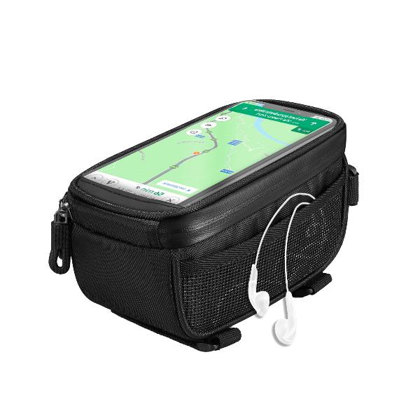 自転車のハンドル部分に取り付ける窓付きのバッグタイプ・マウント。IPX64規格で、雨や泥の心配も不要。バッグに入れたまま画面を確認でき、スワイプ操作にも対応します。