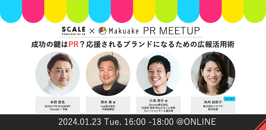 今回の業務提携をきっかけとした取り組みとして、実行者のためのPR勉強会特別版「Makuake × SCALE PR MEETUP」を2024年1月23日(火)に開催します。