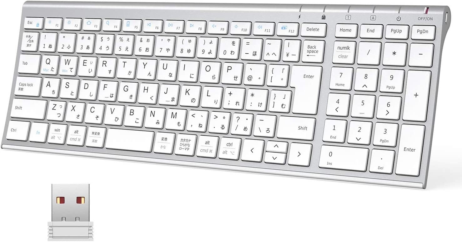 USBレシーバーを差し込むだけで瞬時に接続されるワイヤレスキーボードです。テンキーを搭載した日本語配列のキーボードです。人間工学に基づいた傾斜が手の疲労感を軽減させます。洗練されたスタイリッシュなボディはデスクを上質な空間に仕上げます。また2時間でフル充電ができ、90時間の連続再生が可能です。