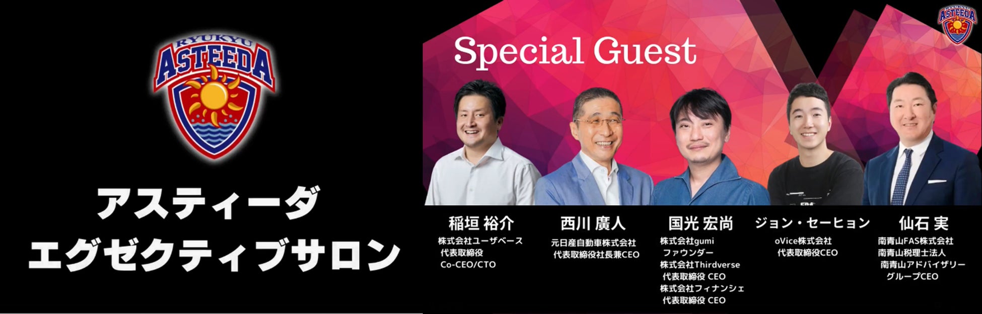 | <開催概要> ●名称:「アスティーダ エグゼクティブ サロン」 ●会期:2023年2月11日(土)〜12日(日) 10:30開場 ●会場:沖縄アリーナ4F ●主催:琉球アスティーダスポーツクラブ株式会社 ●特別協力:oVice株式会社 ●参加対象者:上場企業および上場企業と同規模の企業の経営者・役員 ●参加者数:会場200名・オンライン200名(予定) |