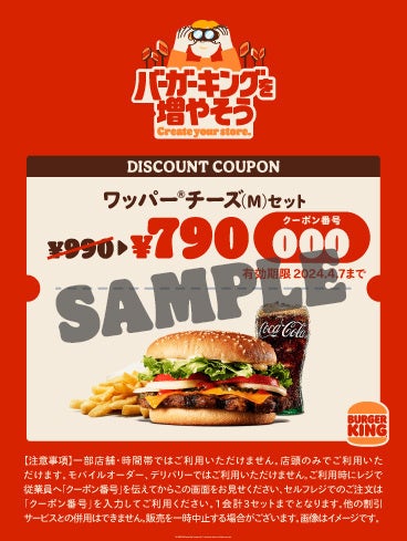 バーガーキング® のお店が近くになく出店を待ち望んでいただいている皆様も、いつもご愛顧いただいているファンの皆様も、ぜひバーガーキング® 公式HP特設WEBサイトの応募フォームに必要事項を記入の上、ご応募ください。見事、ご紹介いただいた物件が成約した場合には、10万円を差し上げます。また、ご応募いただいた方全員に、バーガーキング® 自慢の直火焼きの100%ビーフパティを使用した人気No.1メニュー『ワッパー® チーズ』セットが、通常価格990円のところ200円引きの790円で楽しめるお得なクーポンをもれなくプレゼントいたします。