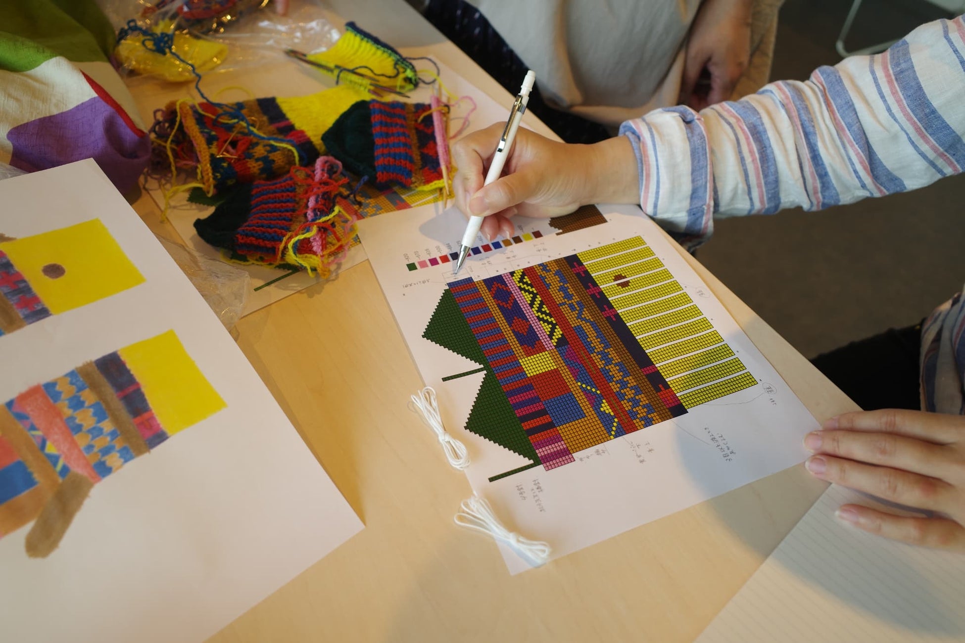 編み手ののりこさんが、伊賀さんのミトンの絵をみながら図面を描き、まずはひとつめのミトンを編み上げました。