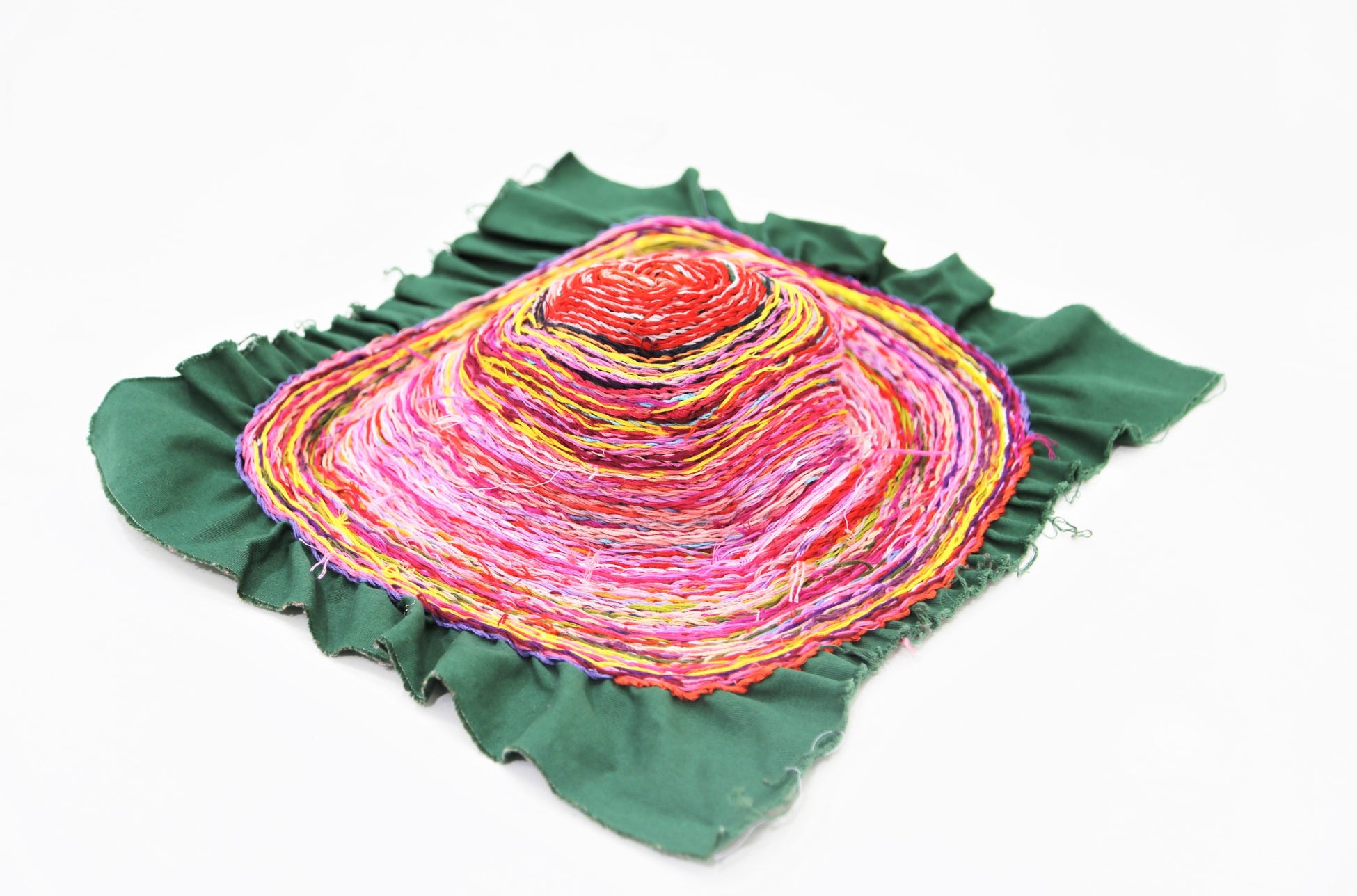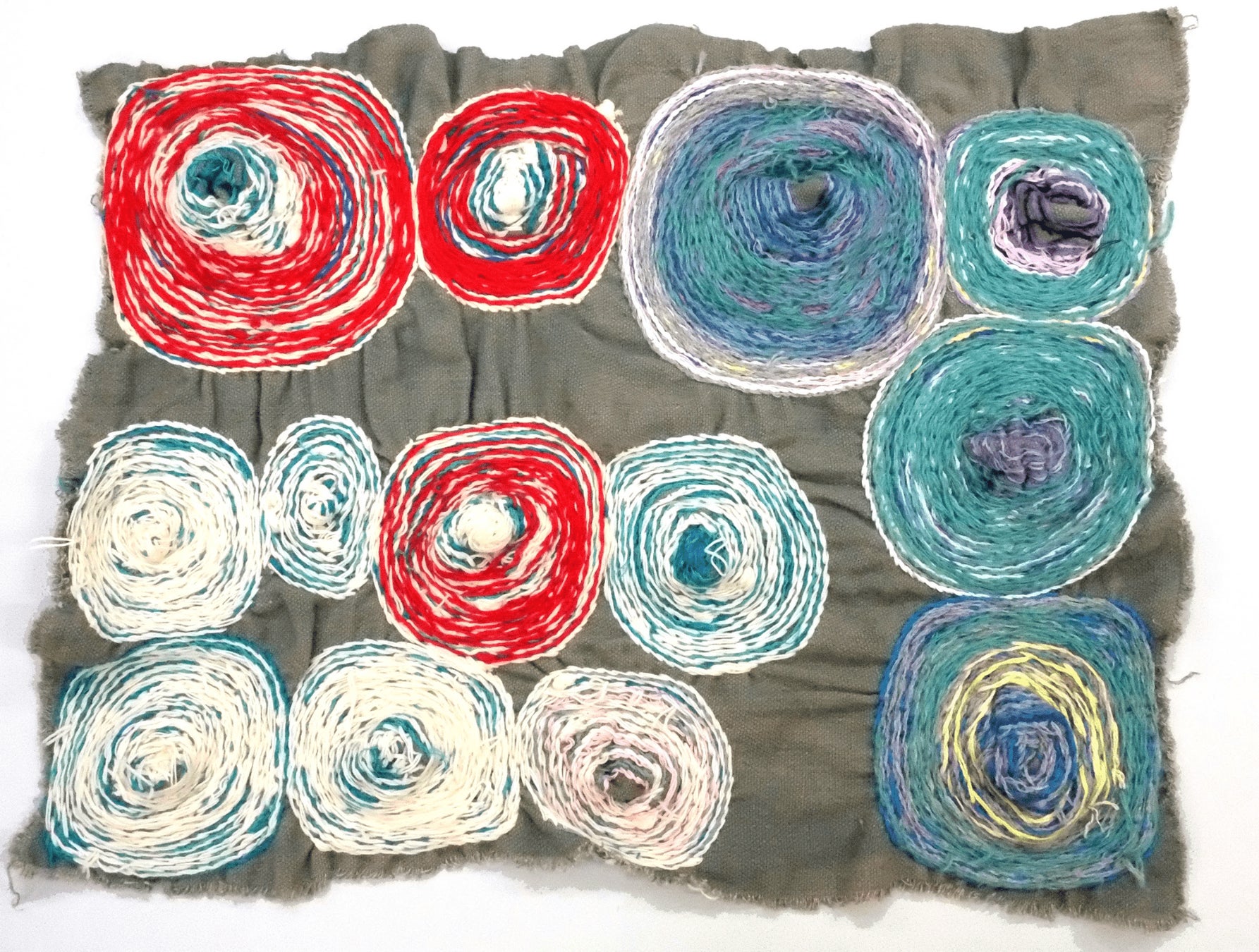 1997年から『やまなみ工房』に所属 彼女の刺繍は「まる」で構成されている。布に円を描きおおよその数と配置を定めると、針を通し、出発地点から斜めに返る独特の縫い方で輪郭をかたどっていく。複数の「まる」は同時進行で進められるが、縫い込みの多さはそれぞれ異なり、一枚の中にも多様な表情を持つ「まる」が生まれる。何層にも円を描き縫い重ねるうち、力によって収縮され平面だった「まる」は山のように隆起し、立体感と重厚感のある作品に仕上がる。