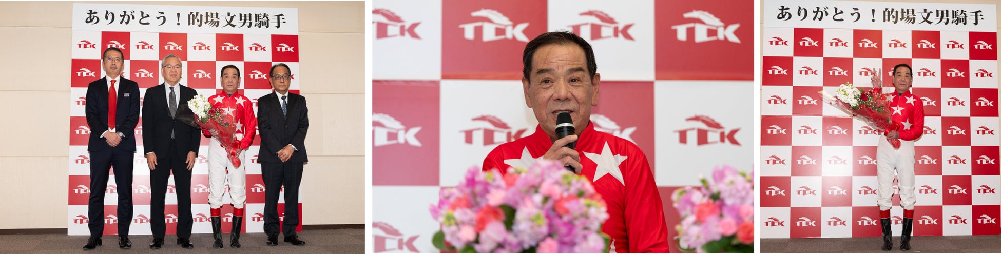 記者会見に先立ち実施されたセレモニーでは、地方競馬全国協会理事長 斉藤弘氏ならびに大井競馬開催執務委員長 桑野俊郎から花束の贈呈が行われ、的場騎手の長年の功績を称えました。