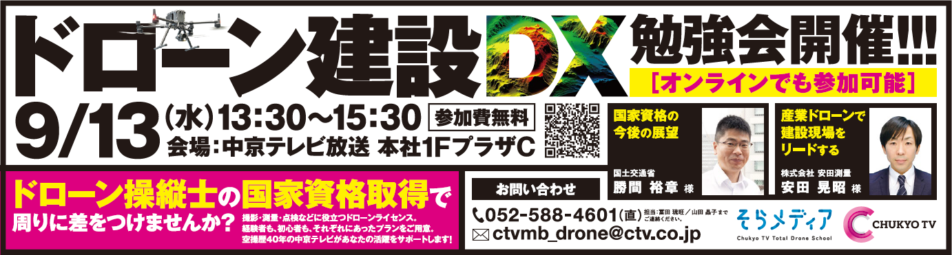 9月13日には、そらメディア主催のセミナー「建築DX勉強会」を開催いたします。セミナーでは、ドローンの活用に関する最新の情報や取り組み事例の紹介、業界で知見のある方をお呼びした勉強会などを予定しております。
