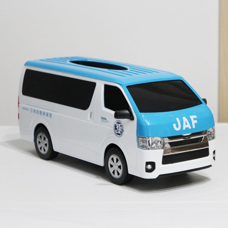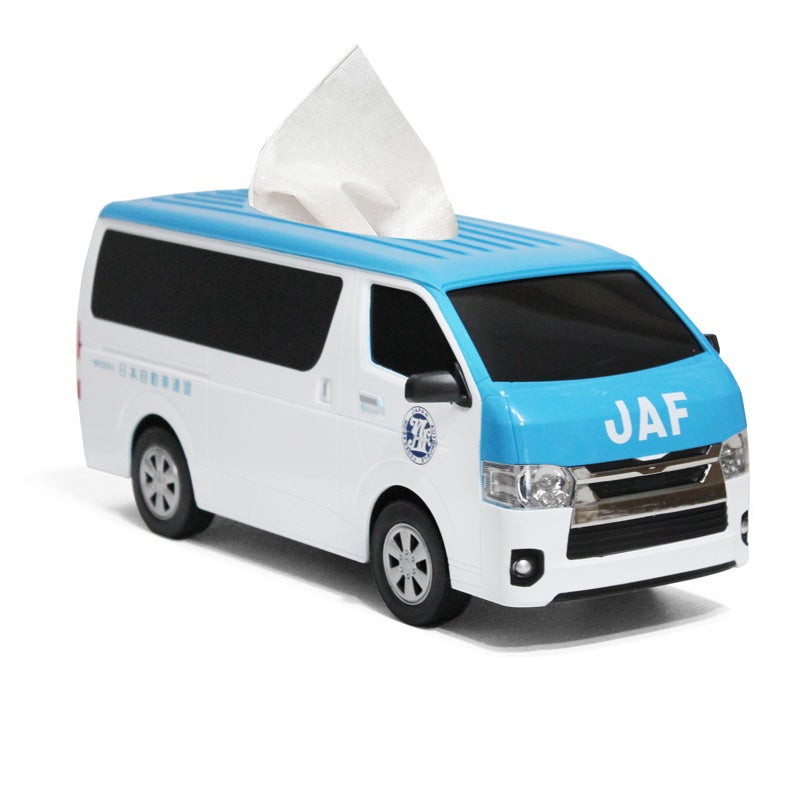 ノリモノの形の雑貨を企画する株式会社フェイスから、JAF (日本自動車連盟)の車両を再現したティッシュケースがノベルティつきで販売を開始しました。