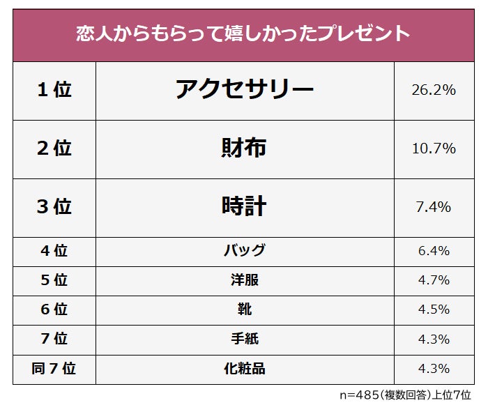 全国の男女485人に「恋人からもらって嬉しかったプレゼント」を聞いたところ、圧倒的1位は「アクセサリー(26.2%)」でした。2位「財布(10.7%)」、3位「時計(7.4%)」、4位「バッグ(6.4%)」が続きます。