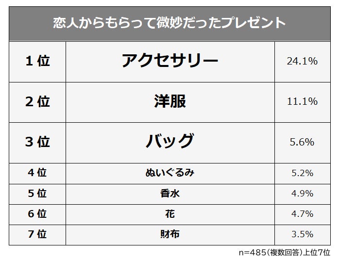 「恋人からもらって微妙だったプレゼント」の1位は「もらって嬉しかったプレゼント」と同じ「アクセサリー(24.1%)」でした。2位「洋服(11.1%)」、3位「バッグ(5.6%)」、4位「ぬいぐるみ(5.2%)」が続きます。