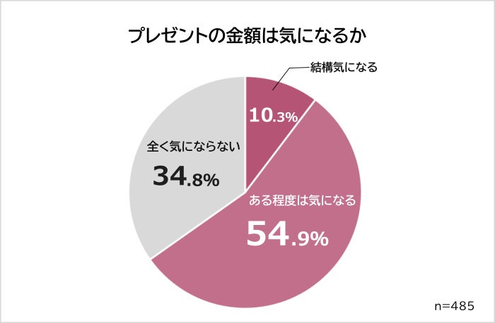 「恋人からもらうプレゼントの金額が気になるか」という問いには、「気になる」と回答した人が「結構(10.3%)」「ある程度(54.9%)」を合わせて65.2%でした。