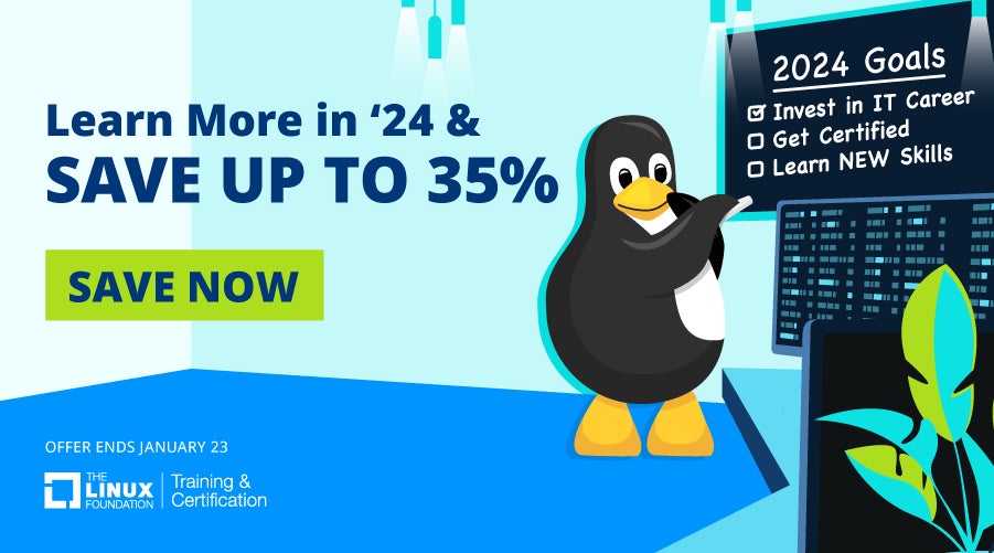 2024年のITキャリアの抱負は何ですか?1月のキャンペーンは、Linux Foundationのトレーニングコース&認定試験を最大35%割引で提供します。現在のキャリアでさらに上のレベルに進むことを目指す場合も、新たな方向へ進むことを決意した場合も、そこに到達するためのプログラムを用意しています。
