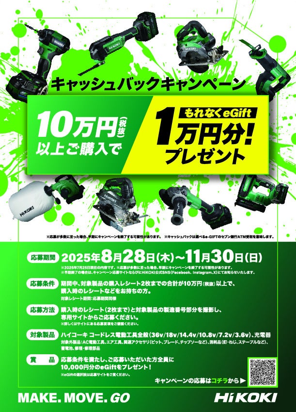 電動・空気工具を販売する工機ホールディングスジャパン株式会社(本社:東京都港区、代表取締役 社長執行 役員 吉田智彦 以下、工機ホールディングスジャパン)が、8月28日からキャッシュバックキャンペーンを開始しました。