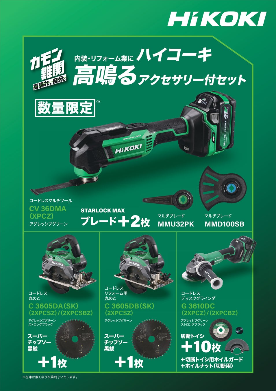 キャッシュバックキャンペーンと同時に、内装・リフォーム業向けの「ハイコーキ高鳴るアクセサリー付きセット」として、コードレスマルチツール・コードレス丸のこ・コードレスリフォーム用丸のこ・コードレスディスクグラインダにブレードなどのアクセサリーが追加になった特別セットを数量限定で発売しております。特別セットの内容については上記キャッシュバックキャンペーン特設サイトおよびハイコーキ製品お取り扱い店舗にてご案内しております。(一部お取り扱い店舗では告知していない場合もございます)