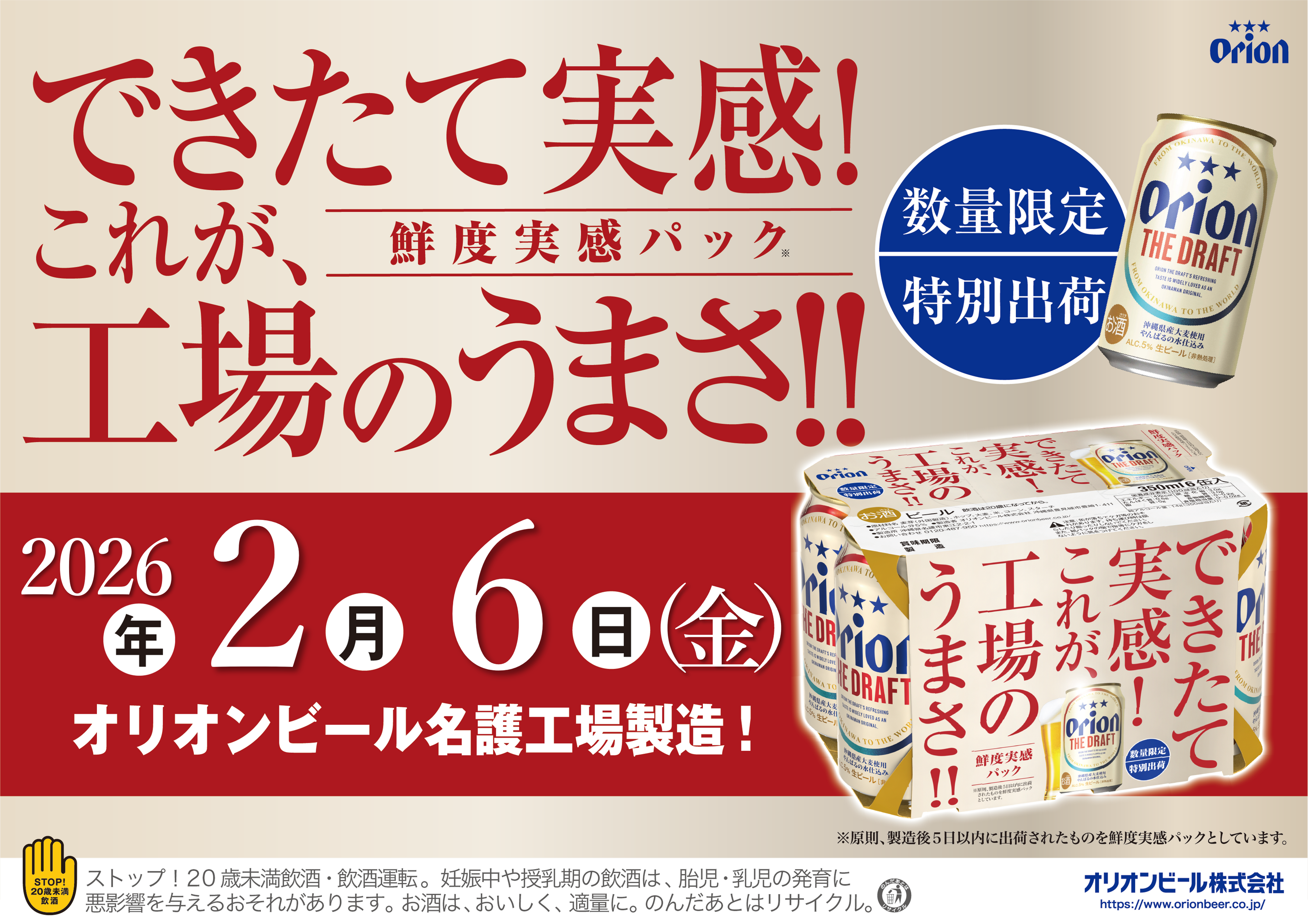 オリオンビール株式会社(本社:沖縄県豊見城市、代表取締役社長 兼 執行役員社長CEO 村野 一)は、沖縄県民の皆さまに工場できたての新鮮なビールのおいしさをお届けする企画として、製造後5日以内に出荷する「オリオン ザ・ドラフト 鮮度実感パック」を、2026年2月、沖縄本島全域にて数量限定で発売いたします。