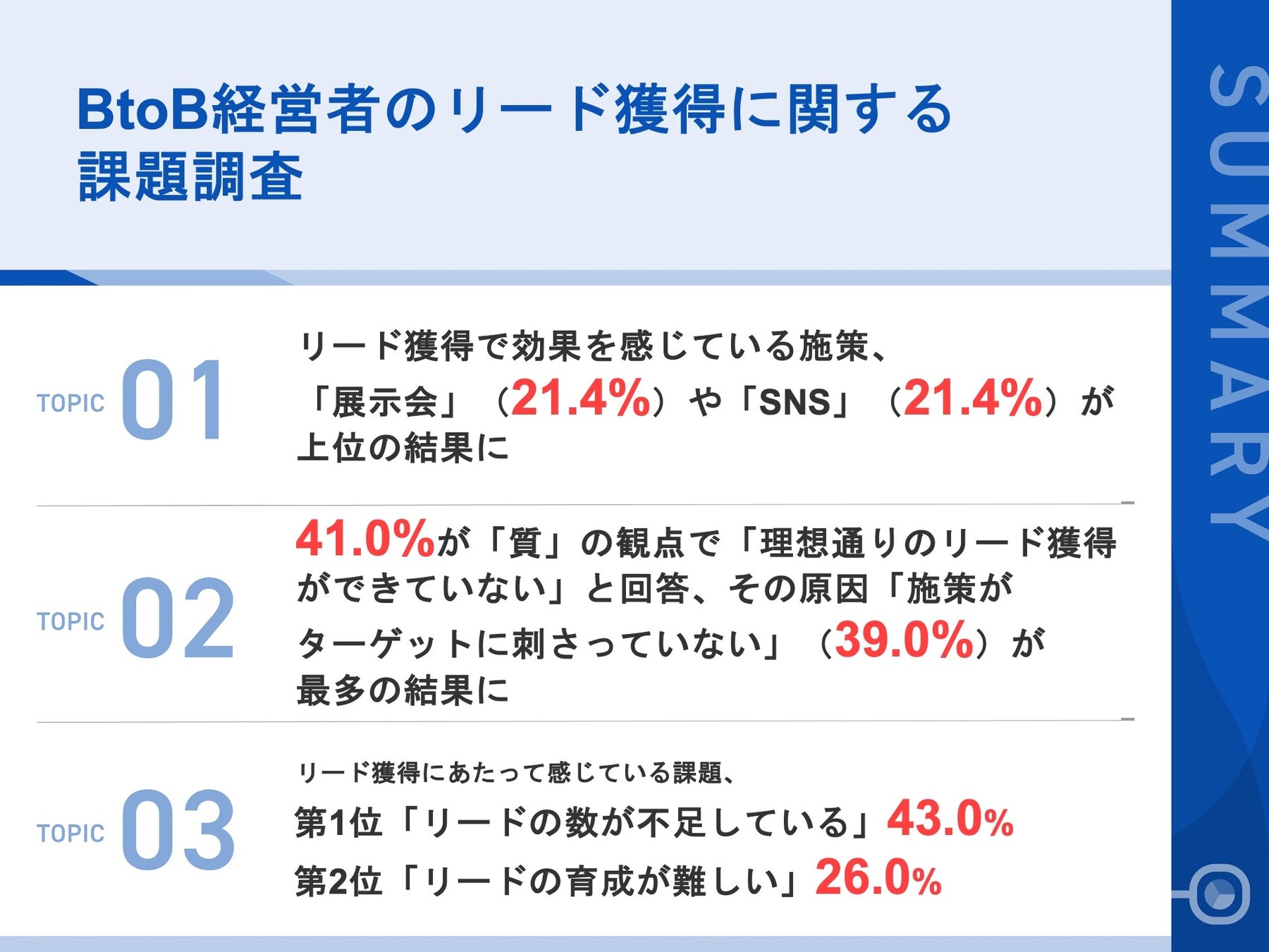 BtoB企業経営者の約4割が「理想通りのリード獲得ができていない」実態!「施策がターゲットに刺さっていない」や「リードのフォローアップが不十分」など、要因が明らかに