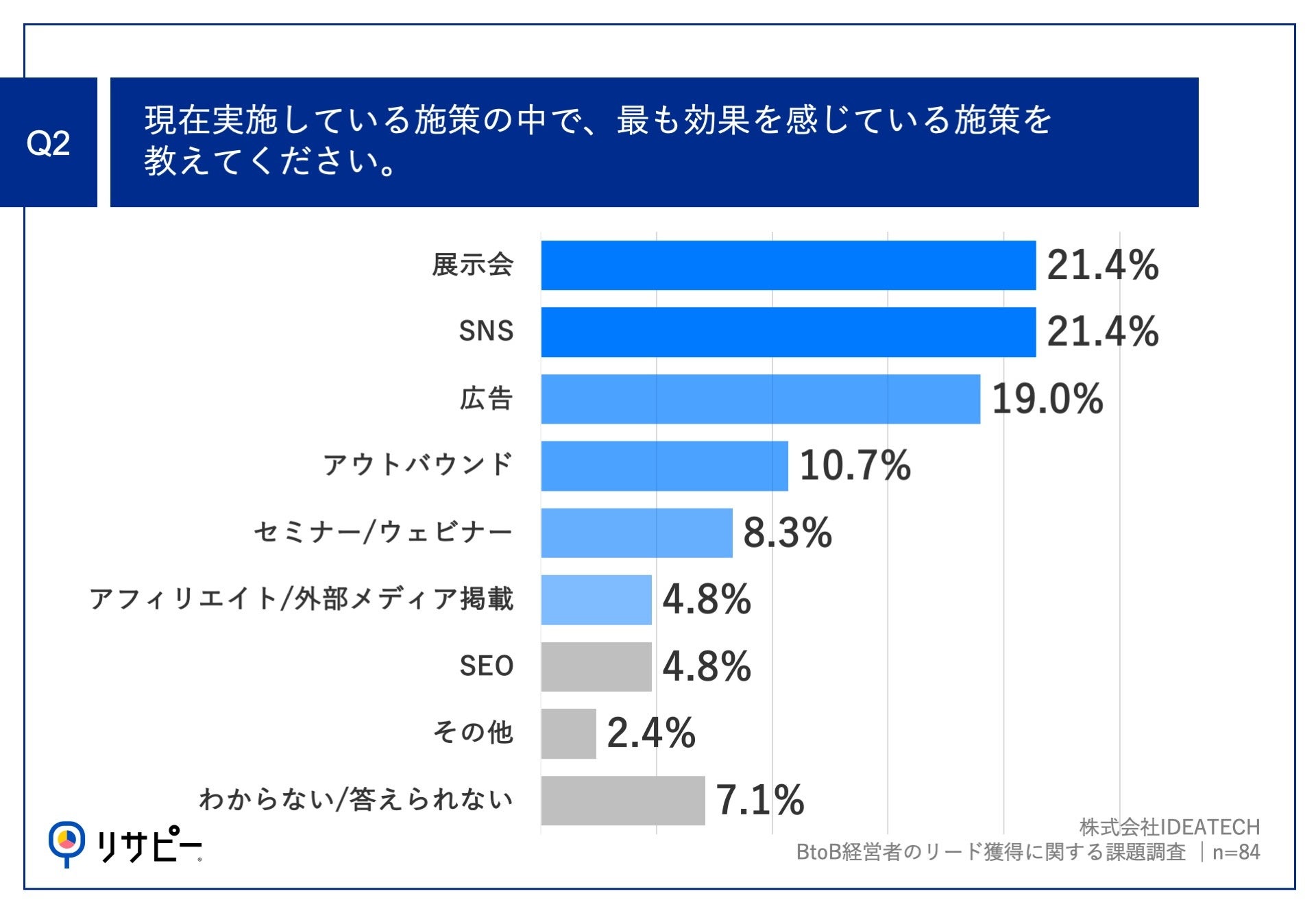 Q1で「わからない/答えられない」と回答した以外の方に、「Q2.現在実施している施策の中で、最も効果を感じている施策を教えてください。」(n=84)と質問したところ、「展示会」が21.4%、「SNS」が21.4%、「広告」が19.0%という回答となりました。
