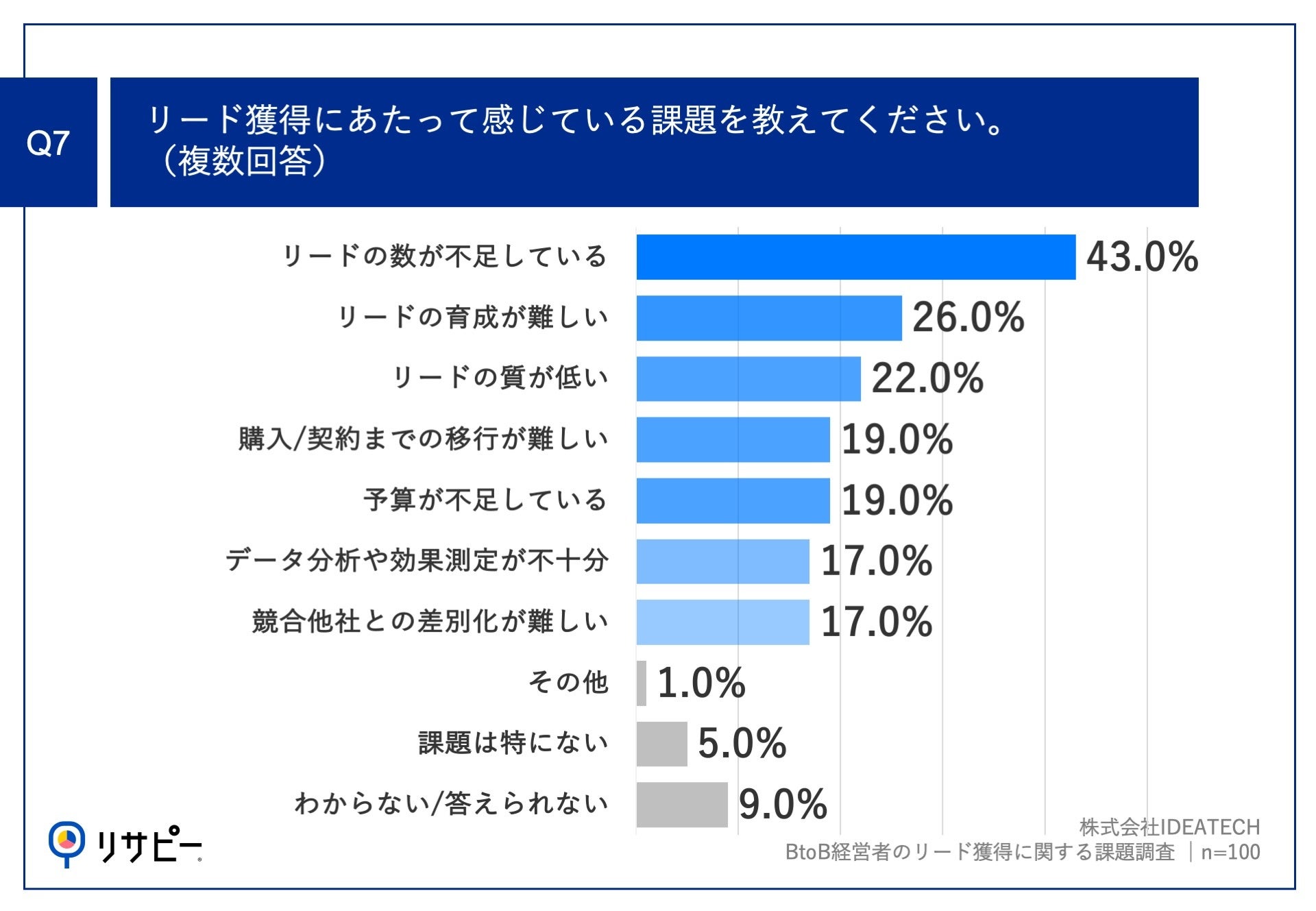 「Q7.リード獲得にあたって感じている課題を教えてください。(複数回答)」(n=100)と質問したところ、「リードの数が不足している」が43.0%、「リードの育成が難しい」が26.0%、「リードの質が低い」が22.0%という回答となりました。