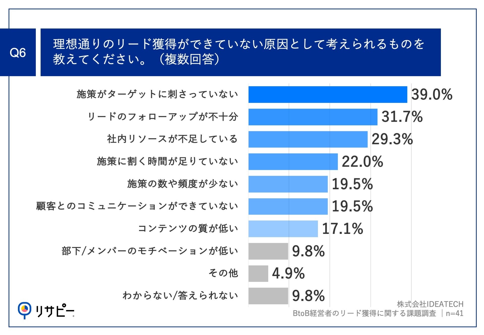 Q5で「あまりそう思わない」「全くそう思わない」と回答した方に、「Q6.理想通りのリード獲得ができていない原因として考えられるものを教えてください。(複数回答)」(n=41)と質問したところ、「施策がターゲットに刺さっていない」が39.0%、「リードのフォローアップが不十分」が31.7%、「社内リソースが不足している」が29.3%という回答となりました。