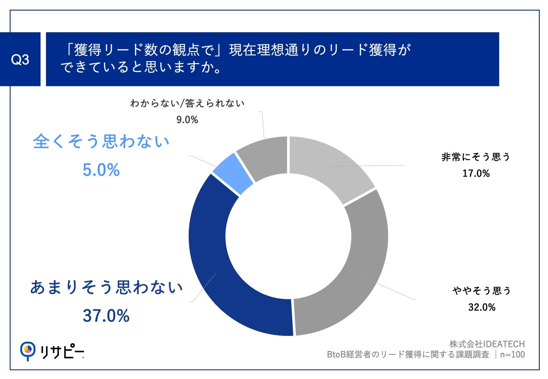 「Q3.「獲得リード数の観点」で、現在理想通りのリード獲得ができていると思いますか。」(n=100)と質問したところ、「あまりそう思わない」が37.0%、「全くそう思わない」が5.0%という回答となりました。