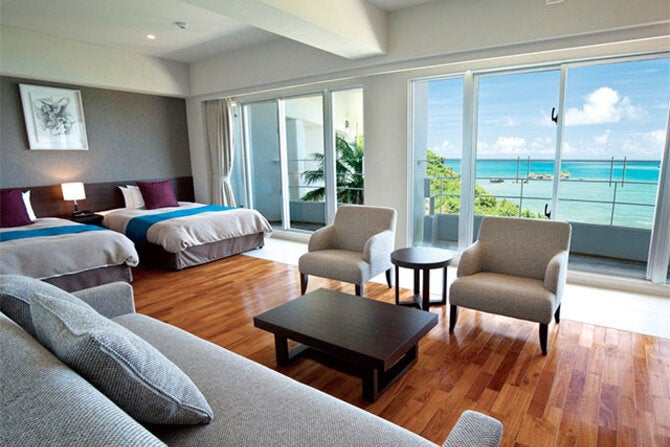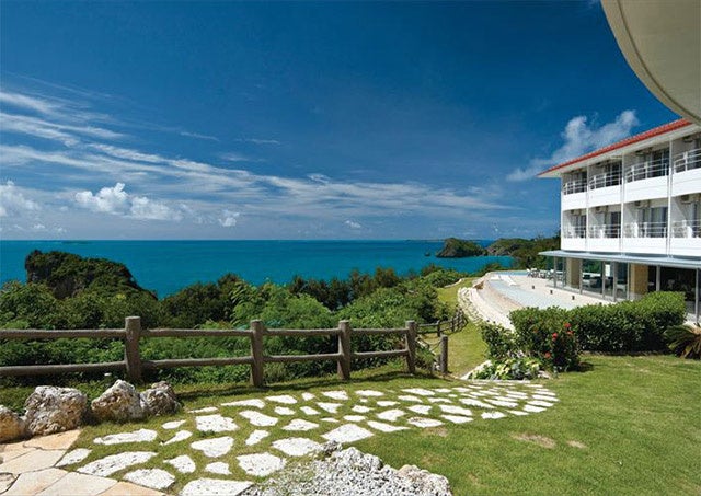 ホテル浜比嘉島リゾートは、島の高台に立つ全29室の小規模リゾートホテルです。最上階(4階)の展望風呂からは太平洋を一望でき、屋外プールや徒歩3分の天然ビーチ「ムルク浜」など、眼前に広がる大パノラマの海が魅力です。