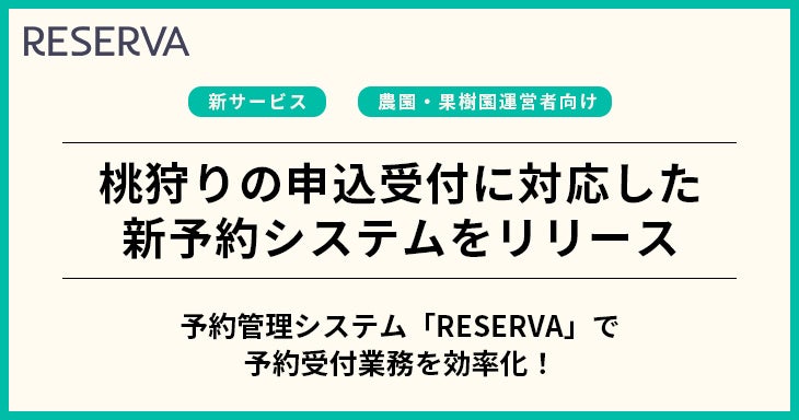 RESERVA(https://reserva.be)は、農園や果樹園など350業種以上に対応した業界最大級の予約システム。導入社数は27万社を超え、最近ではいちご狩りやさくらんぼ摘みなど季節の果物狩りイベントで活用されている。6月の繁忙期を見越して、複数の桃農園からより効率的な顧客管理とスケジューリングを行いたいとの要望が高まり、桃狩りの予約に特化したシステムのリリースに至った。