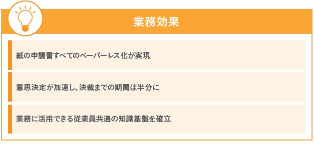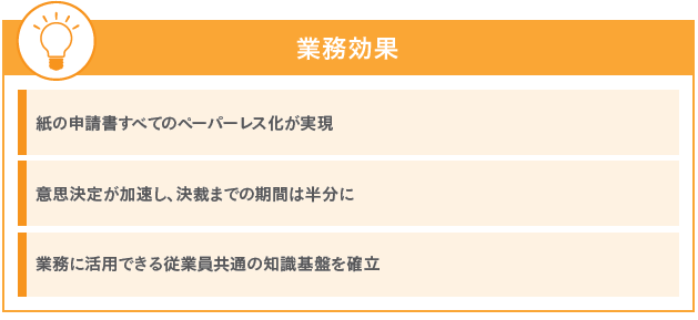 申請業務の電子化に加えて、全社的な業務改善運動の中で上がった既存の紙の申請書の様式を変更し、作業効率を向上させるアイデアを実現するにあたり不可欠な、細やかかつ柔軟にフォーム作成可能な機能をご評価いただきました。また、システム導入後には従業員が外出時にも申請書の作成や承認作業を行える体制を目指していたことから、社外からもアクセスしやすいクラウド製品であることも後押しとなりました。