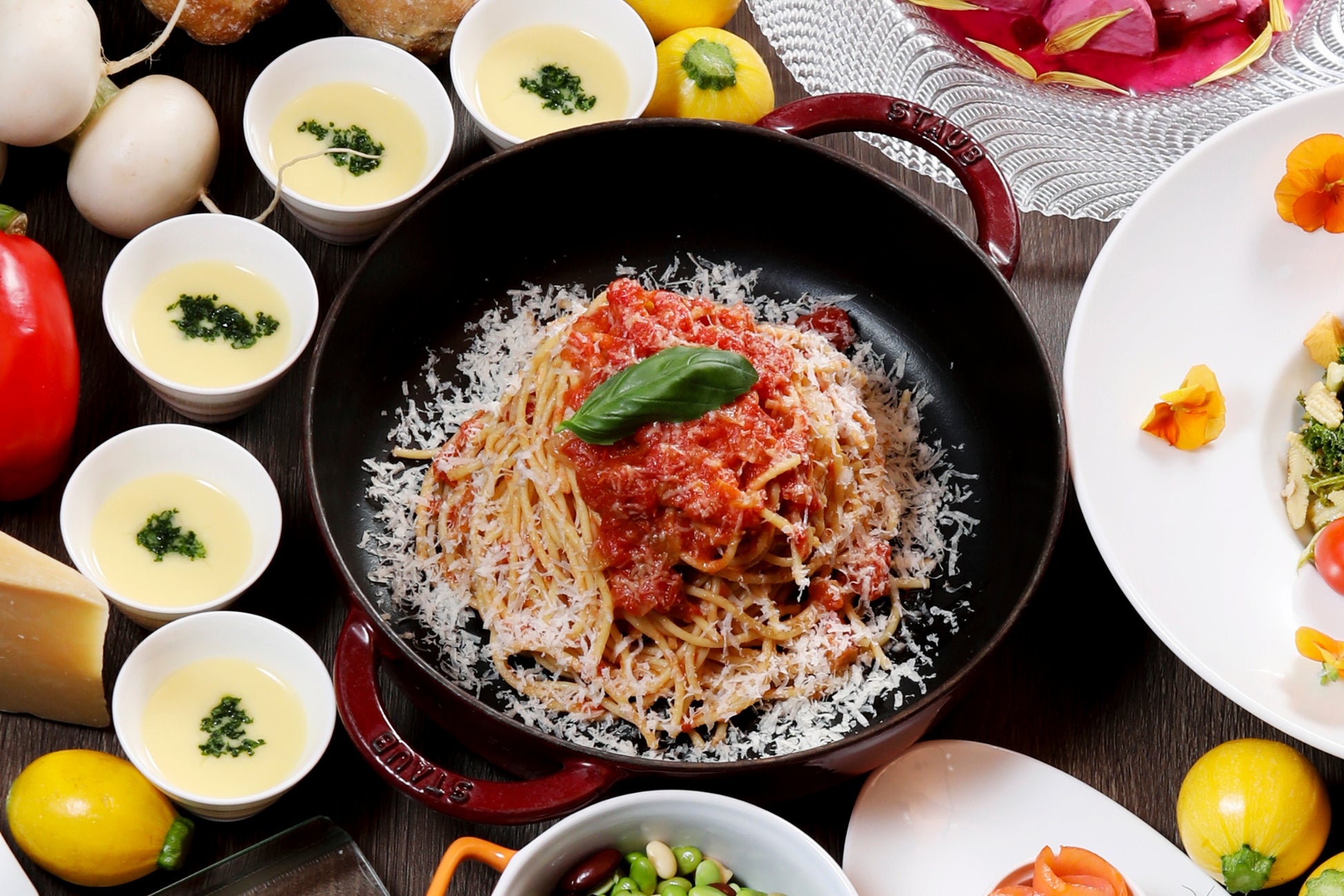 シェフがお客さまの目の前で仕上げる 「濃厚パルミジャーノ・チーズパスタ」は、巨大なパルミジャーノ・レッジャーノチーズの上で豪快にチーズをからめる「ライブ感」が見ているだけで食欲をそそる。
