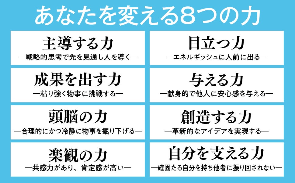 独自の心理テストからわかる8つの「一番の強み」を自覚し、使いこなすことで、内側からにじみ出る自信が身につきます。