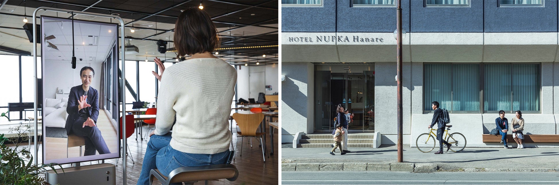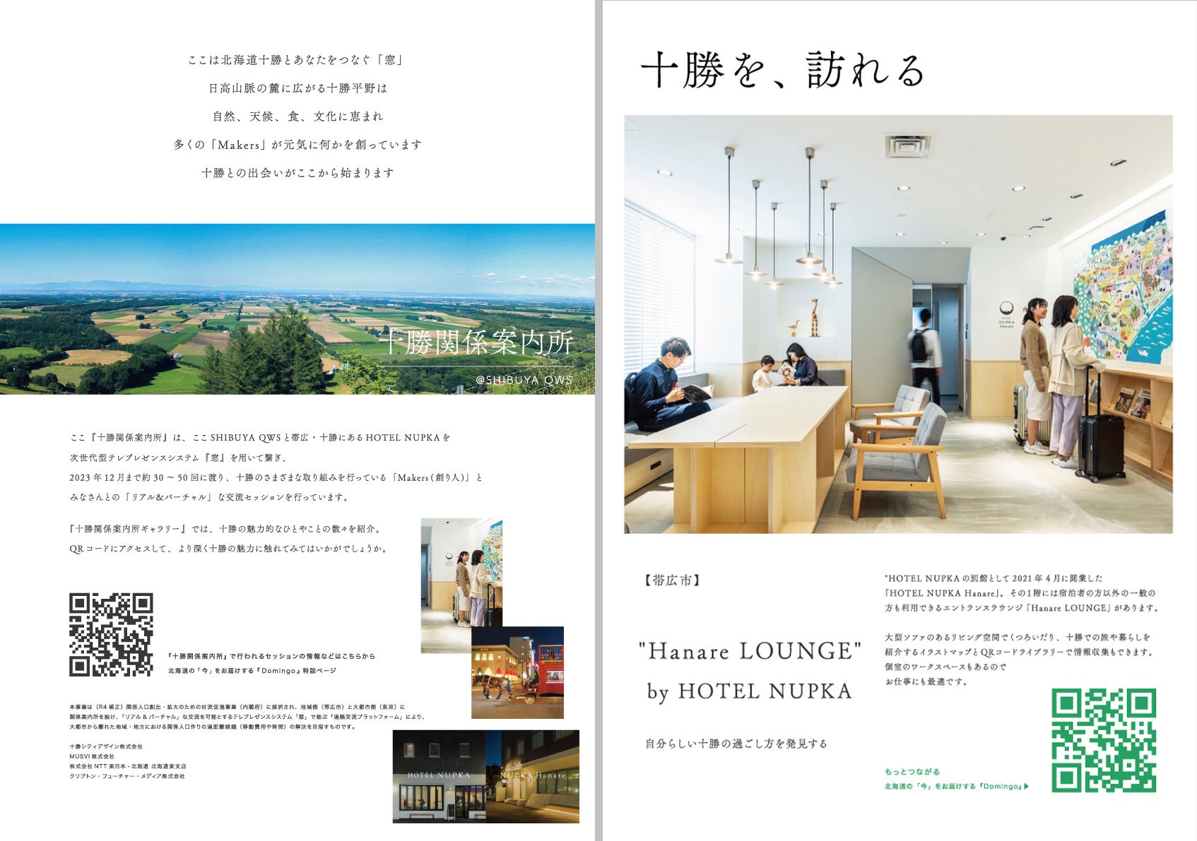 本事業では、地域側(北海道帯広市・HOTEL NUPKA)と首都圏側(東京都渋谷区・SHIBUYA QWS)の双方に「十勝関係案内所」を設け、リアル&バーチャルな交流を可能とするテレプレゼンスシステム「窓」(MUSVI株式会社)を設置。2つの関係案内所を結ぶ「遠隔交流プラットフォーム」を構築し、北海道十勝エリアと首都圏をデジタルコミュニケーションツールによって繋ぎます。また、地域人材の交流と十勝への来訪を誘発するため、十勝でモノ作りやコト作りを行う「Makers(創り人)」の取り組みを紹介する「関係案内セッション」を、2023年9月から12月までに約30~50回ほど実施する予定です。