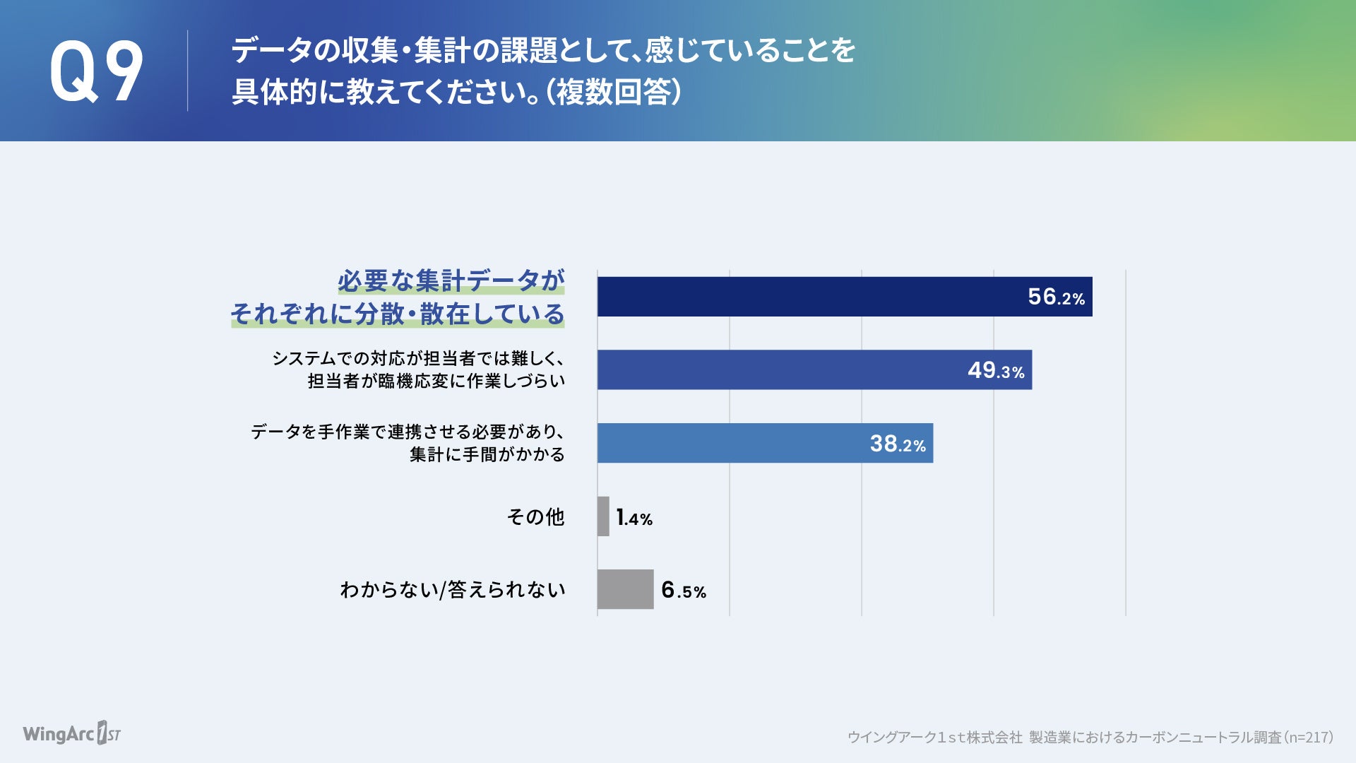 Q8で「非常に課題を感じている」「やや課題を感じている」と答えられた方に、「Q9.データの収集・集計の課題として、感じていることを具体的に教えてください。(複数回答)」(n=217)と質問したところ、「必要な集計データがそれぞれに分散・散在している」が56.2%、「システムでの対応が担当者では難しく、担当者が臨機応変に作業しづらい」が49.3%、「データを手作業で連携させる必要があり、集計に手間がかかる(Scope3の計算を手計算でする必要など)」が38.2%という回答となりました。