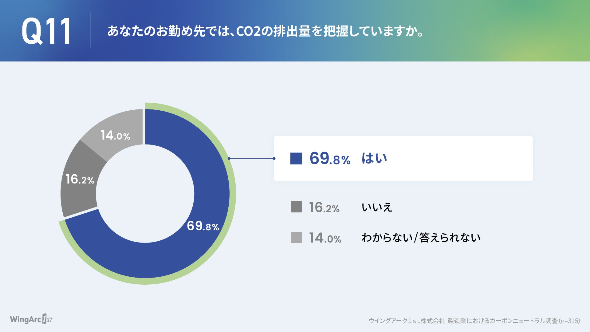 「Q11.あなたのお勤め先では、CO2の排出量を把握していますか。」(n=315)と質問したところ、「はい」が69.8%、「いいえ」が16.2%という回答となりました。