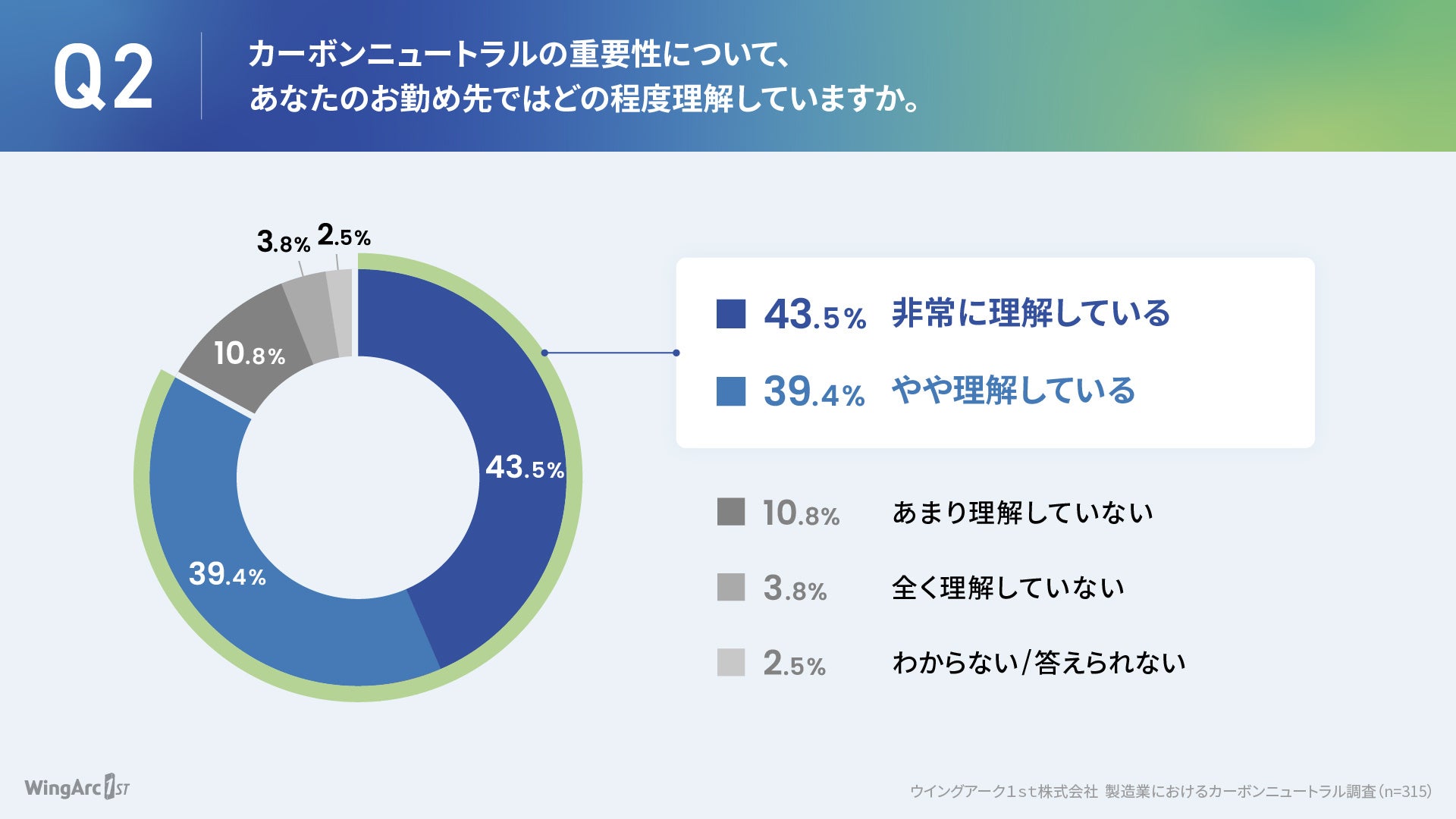 「Q2.カーボンニュートラルの重要性について、あなたのお勤め先ではどの程度理解していますか。」(n=315)と質問したところ、「非常に理解している」が43.5%、「やや理解している」が39.4%という回答となりました。