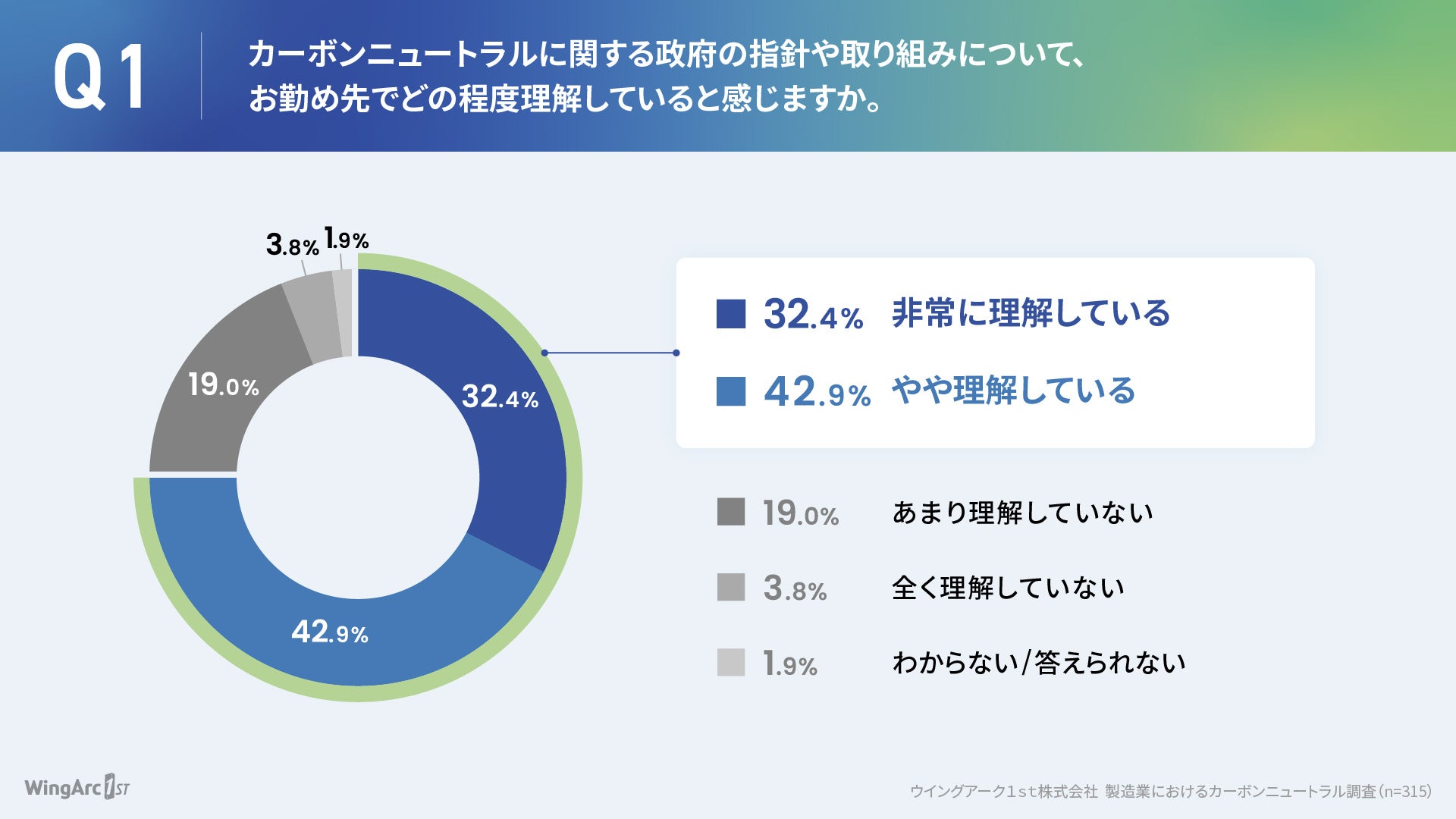 「Q1.カーボンニュートラルに関する政府の指針や取り組み(※2)について、お勤め先でどの程度理解していると感じますか。」(n=315)と質問したところ、「非常に理解している」が32.4%、「やや理解している」が42.9%という回答となりました。