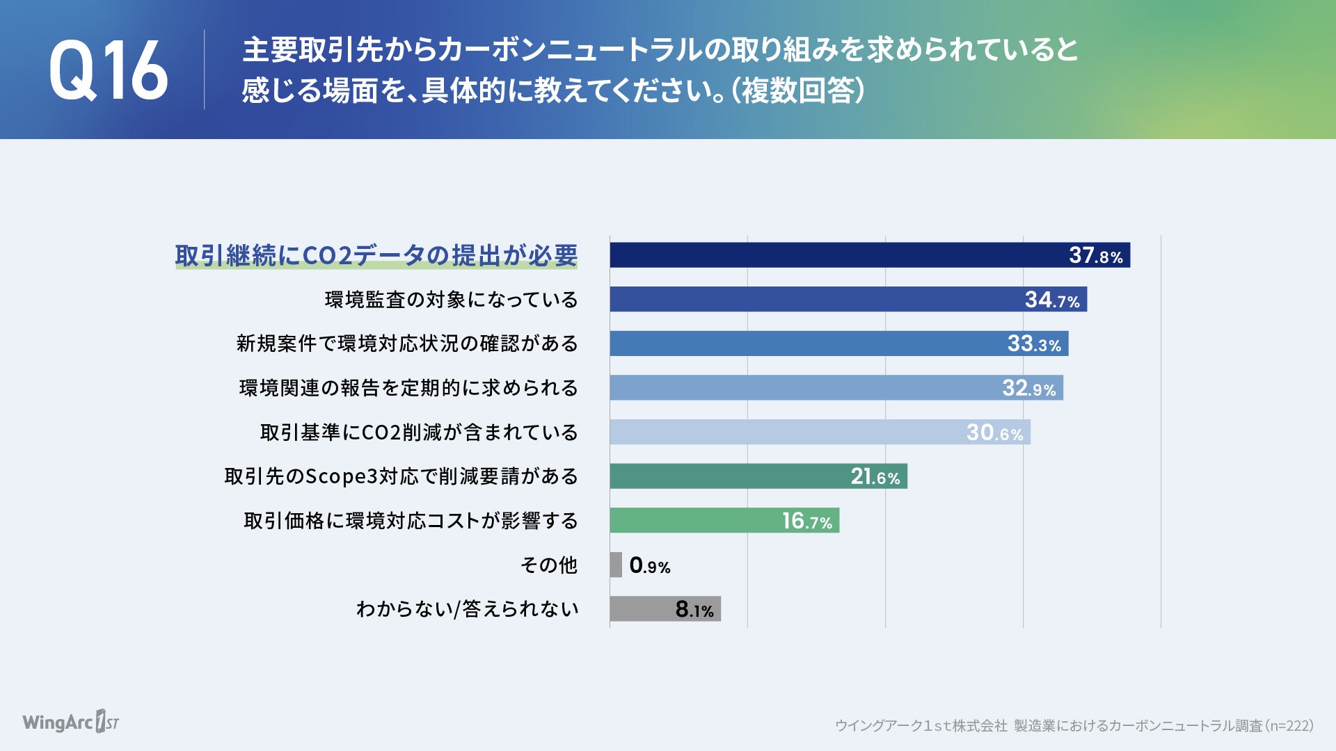 Q15で「非常にそう感じる」「ややそう感じる」と回答した方に、「Q16.主要取引先からカーボンニュートラルの取り組みを求められていると感じる場面を、具体的に教えてください。(複数回答)」(n=222)と質問したところ、「取引継続にCO2データの提出が必要」が37.8%、「環境監査の対象になっている」が34.7%、「新規案件で環境対応状況の確認がある」が33.3%という回答となりました。