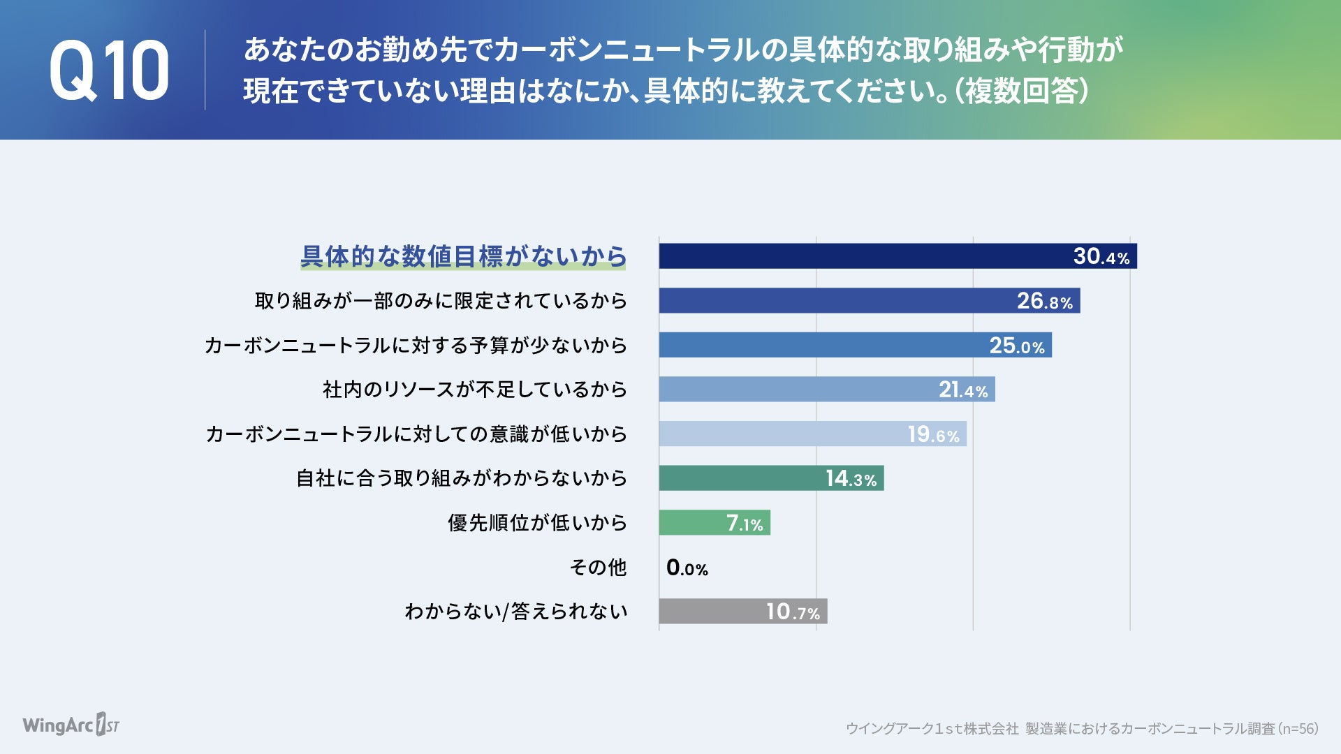 Q3で「今後取り組む予定がある」と回答した方に、「Q10.あなたのお勤め先でカーボンニュートラルの具体的な取り組みや行動が現在できていない理由はなにか、具体的に教えてください。(複数回答)」(n=56)と質問したところ、「具体的な数値目標がないから」が30.4%、「取り組みが一部のみに限定されているから」が26.8%、「カーボンニュートラルに対する予算が少ないから」が25.0%という回答となりました。