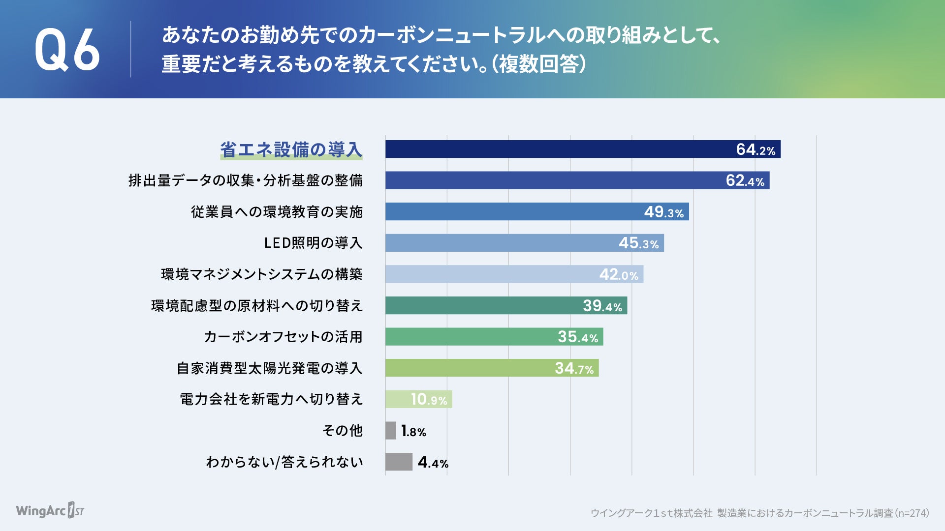 Q3で「現在取り組んでいる」「今後取り組む予定がある」と回答した方に、「Q6.あなたのお勤め先でのカーボンニュートラルへの取り組みとして、重要だと考えるものを教えてください。(複数回答)」(n=274)と質問したところ、「省エネ設備の導入」が64.2%、「排出量データの収集・分析基盤の整備」が62.4%、「従業員への環境教育の実施」が49.3%という回答となりました。