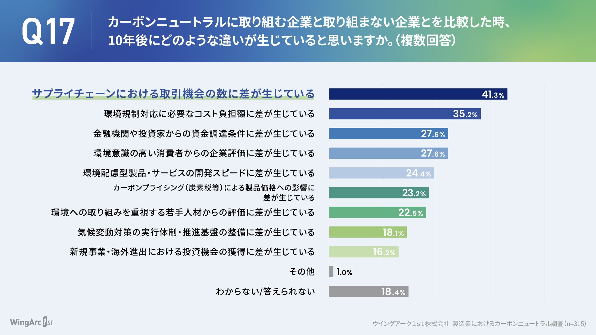 「Q17.カーボンニュートラルに取り組む企業と取り組まない企業とを比較した時、10年後にどのような違いが生じていると思いますか。(複数回答)」(n=315)と質問したところ、「サプライチェーンにおける取引機会の数に差が生じている」が41.3%、「環境規制対応に必要なコスト負担額に差が生じている」が35.2%という回答となりました。