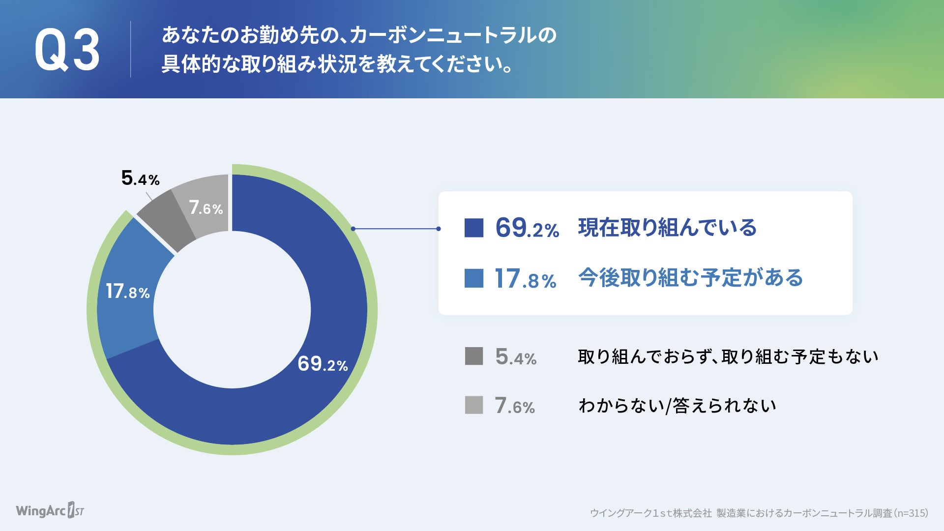 「Q3.あなたのお勤め先の、カーボンニュートラル(※3)の具体的な取り組み状況を教えてください。」(n=315)と質問したところ、「現在取り組んでいる」が69.2%、「今後取り組む予定がある」が17.8%という回答となりました。