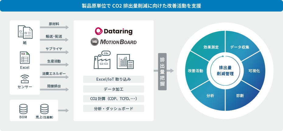 「MotionBoard」は、環境情報を「見える化」し、分析・改善を支援するソリューションです。紙やExcel、IoTなどから必要なデータを収集し、常に最新のCO2排出量を可視化。改善に向けた判断を可能にし、企業全体のCO2排出抑制を実現します。
