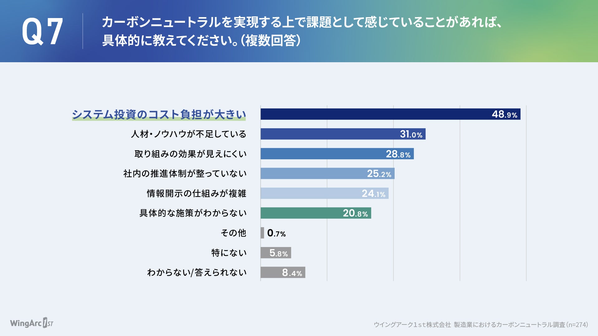 7.カーボンニュートラルを実現する上での課題、第1位「システム投資のコスト負担が大きい」