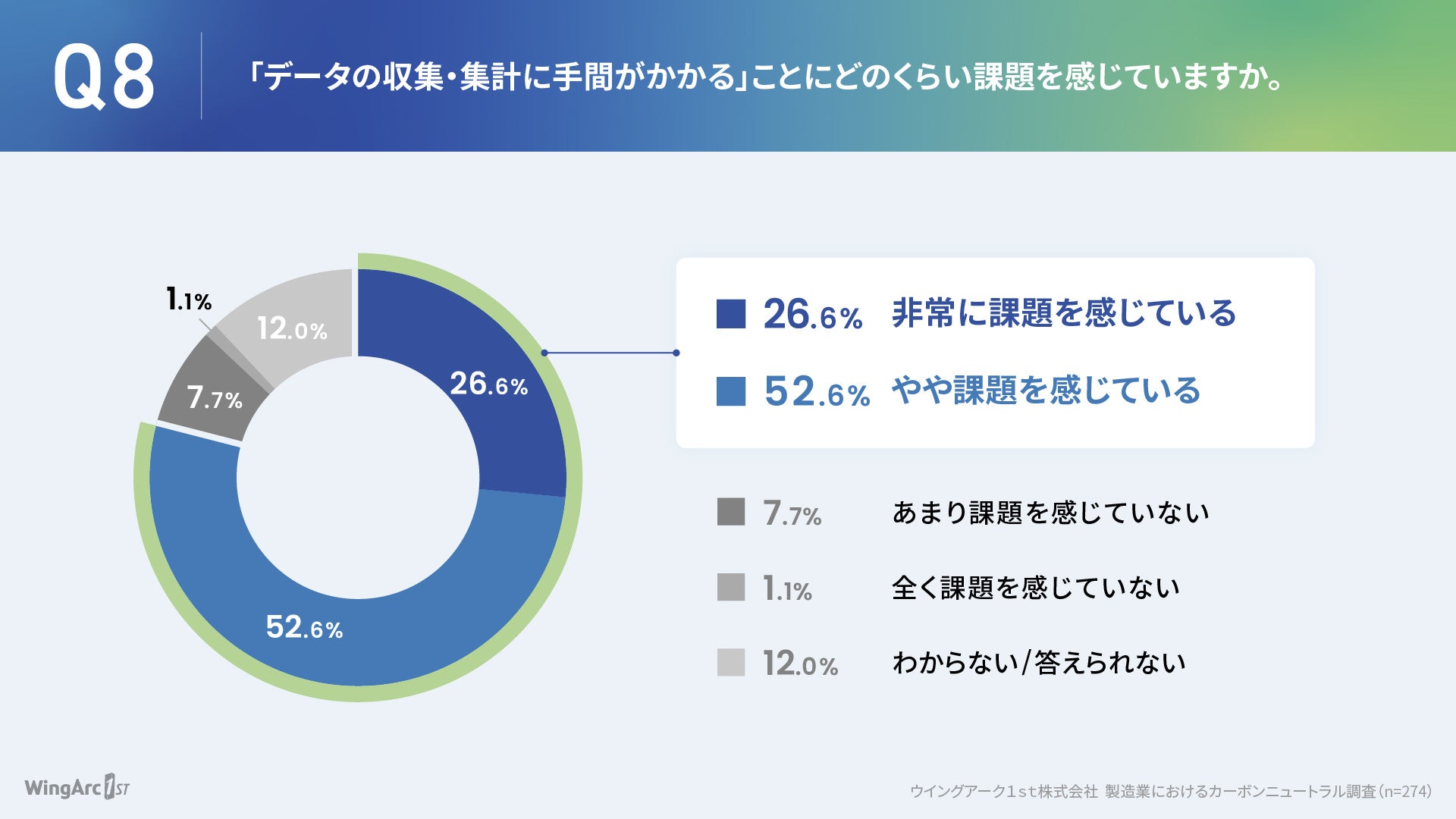 Q3で「現在取り組んでいる」「今後取り組む予定がある」と回答した方に、「Q8.「データの収集・集計に手間がかかる」ことにどのくらい課題を感じていますか。」(n=274)と質問したところ、「非常に課題を感じている」が26.6%、「やや課題を感じている」が52.6%という回答となりました。