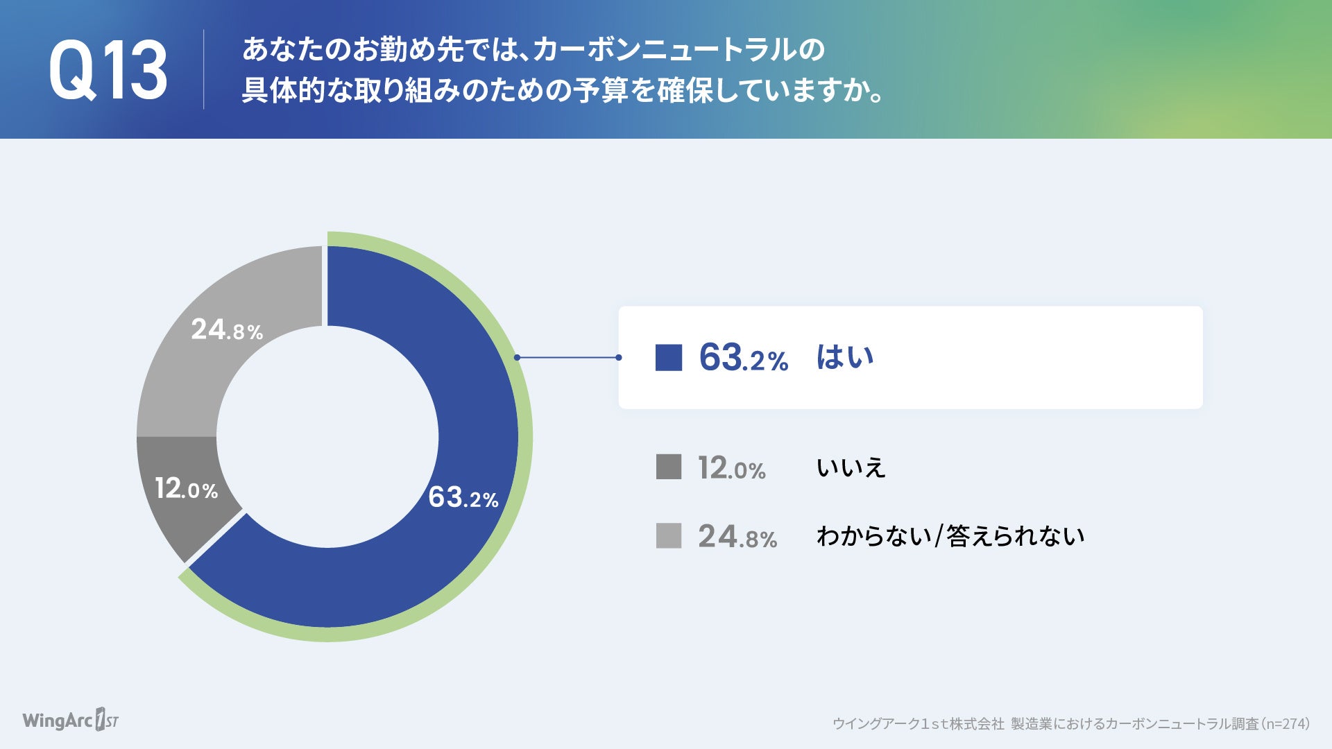 Q3で「現在取り組んでいる」「今後取り組む予定がある」と回答した方に、「Q13.あなたのお勤め先では、カーボンニュートラルの具体的な取り組みのための予算を確保していますか。」(n=274)と質問したところ、「はい」が63.2%、「いいえ」が12.0%という回答となりました。
